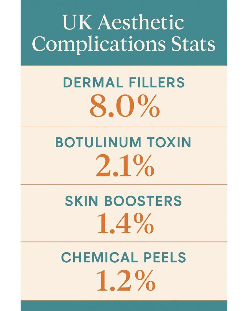 Reported aesthetic complication trends in the UK show dermal fillers carry the highest risk profile, followed by botulinum toxin, skin boosters, and chemical peels. This highlights why structured training, early recognition, and access to expert support are critical at every level of practice.